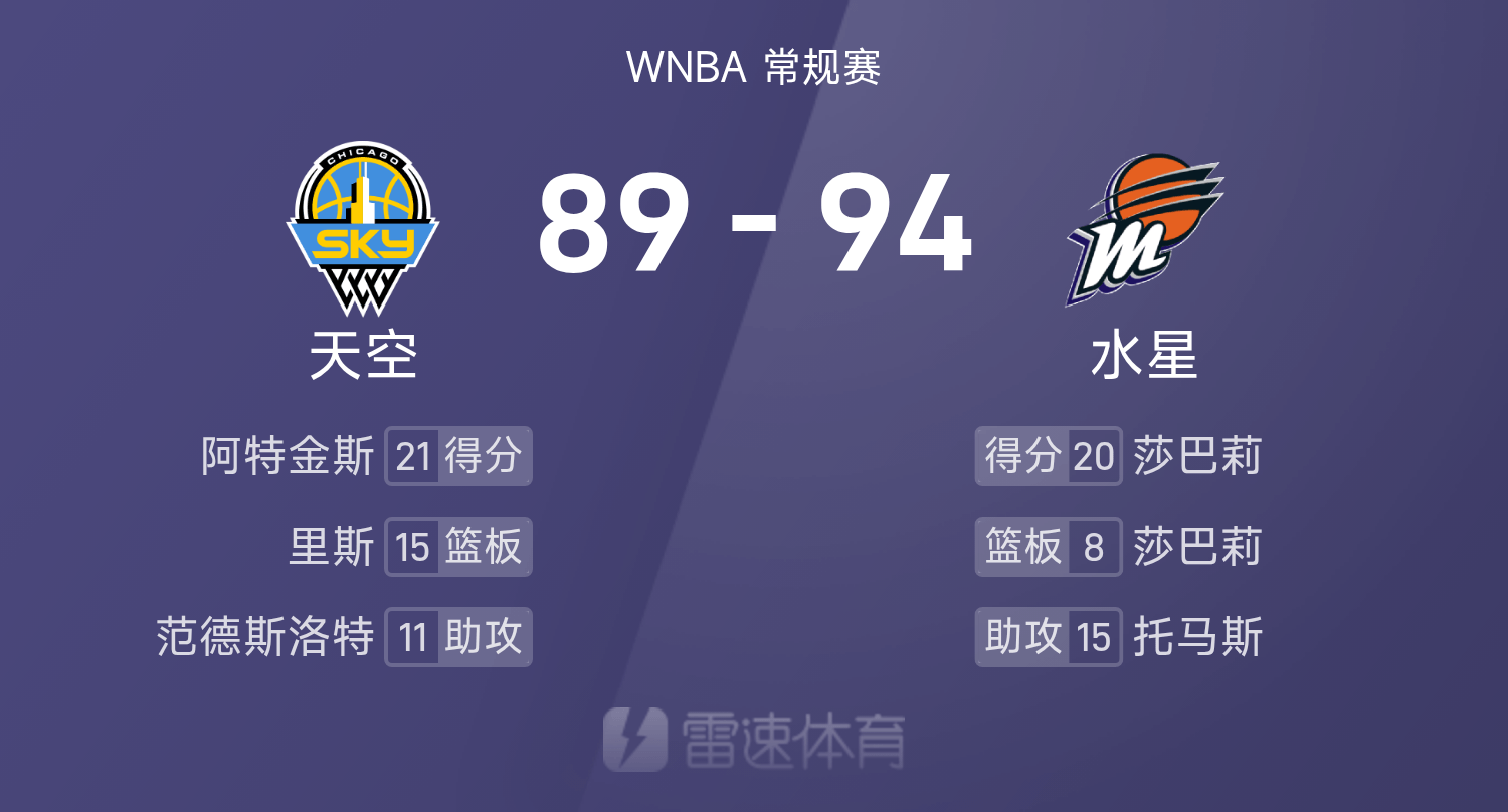 🏀WNBA战报:莎巴莉20分8板,阿特金斯21分6板,水星94-89击败天空